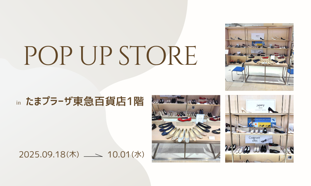 たまプラーザ1階にてjuperyのポップアップストアが期間限定でOPEN! 秋冬の新作パンプスから雨の日も履ける晴雨兼用のシューズまで、さまざま取り揃えてございます。大人の女性に使いやすいカラーやデザインのアイテムばかりですので、ぜひともお気軽にお立ち寄りください。