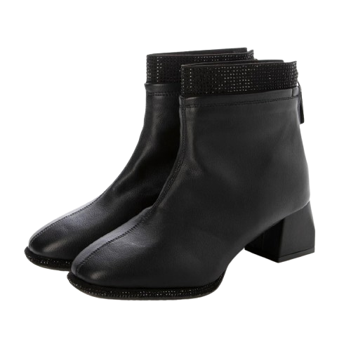 履き口とソールまわりのラインストーンがラグジュアリー感のあるショートブーツ。